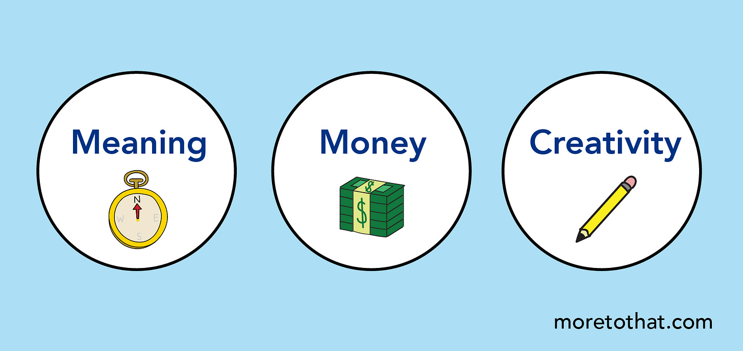 So there you have it. More To That will explore the intersection of meaning, money, and creativity because that’s where lasting contentment is found. Sometimes I’ll discuss all 3 domains at once, and other times I’ll discuss them separately. But as you’ll see, they’re all interconnected in some way, and my goal is to make this whole journey both insightful and fun.