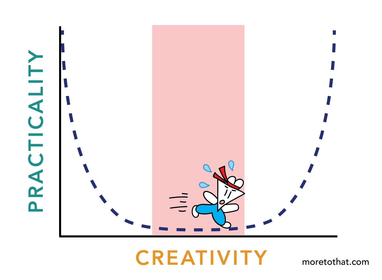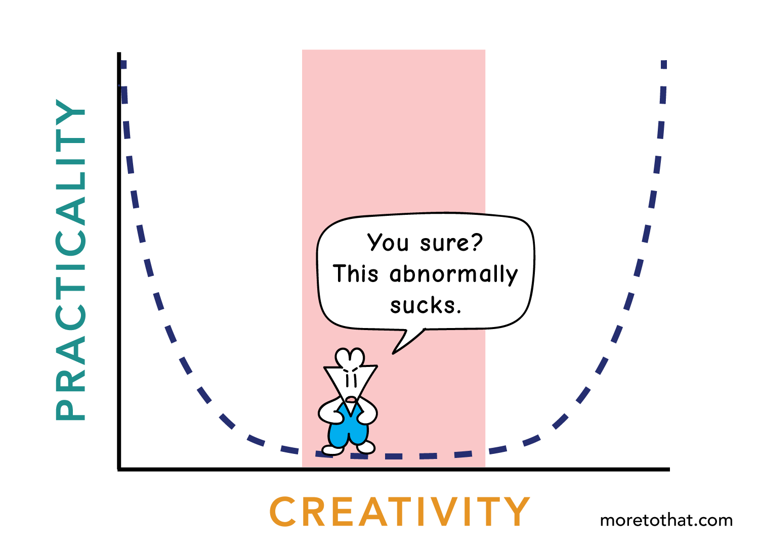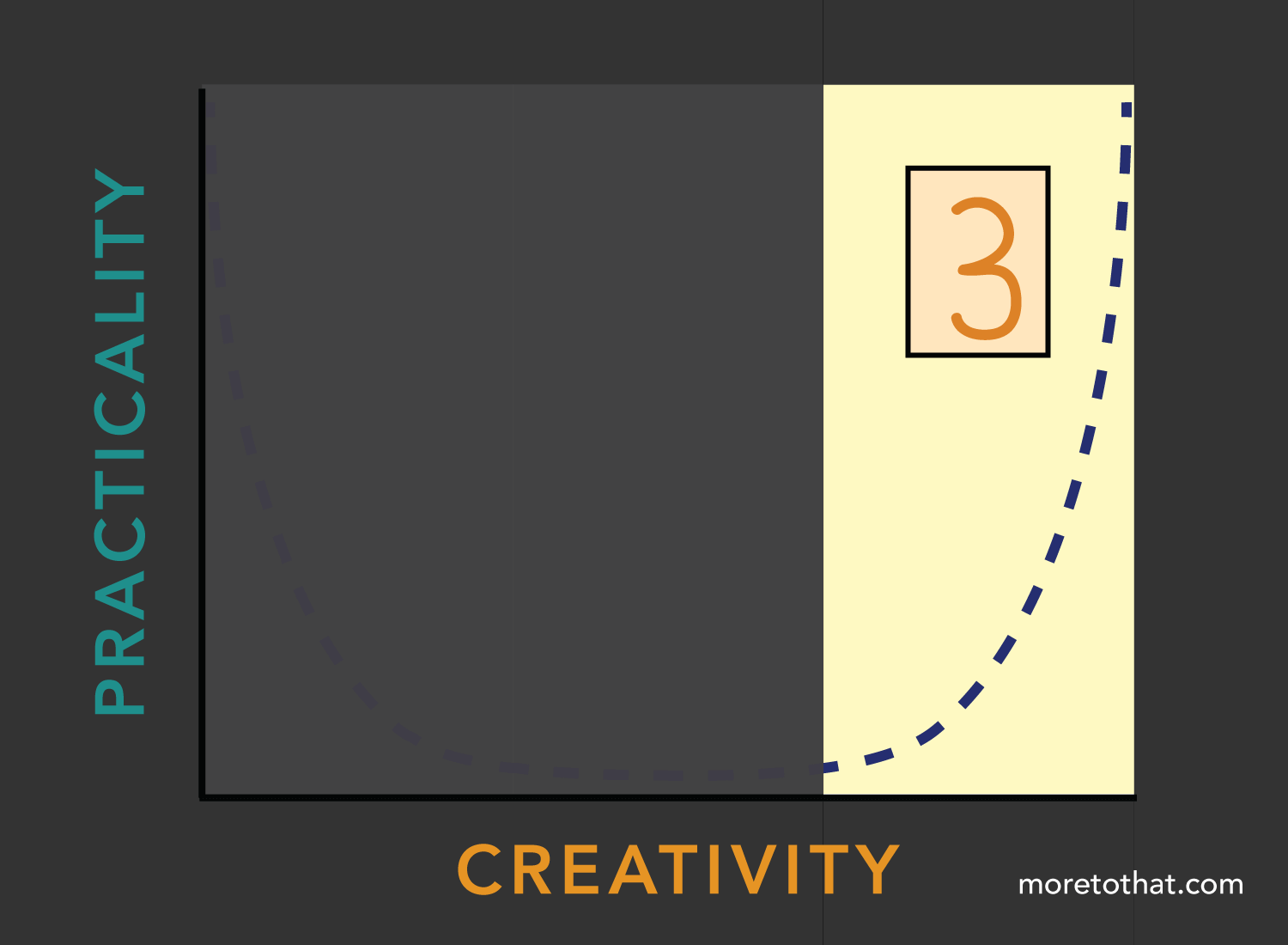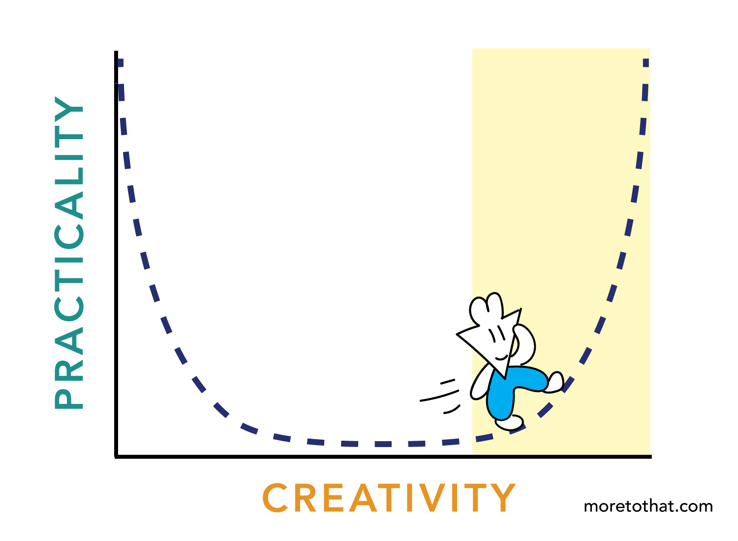 So far, both the curves I’ve shown on the Practicality / Creativity graph aren’t nuanced enough. They favor one extreme over the other, and are not wise roadmaps to reference when thinking through your own creative journey. After reflecting on this, I’ve come to realize that the optimal curve is the one I’ve illustrated below: